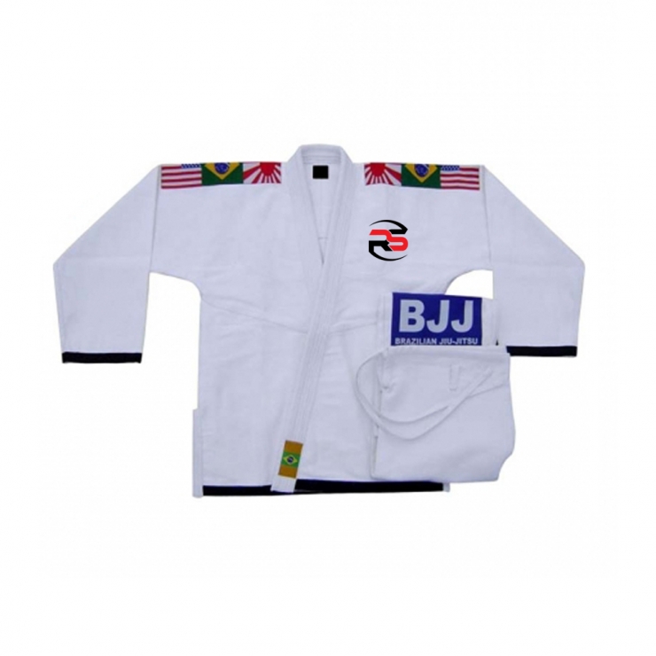 .Jiu Jitsu Uniforms Made of 100% Cotton Single Weave (Also Available in Double Weave) Brushed quality, Heavy weight 15-O-Z (420Gms) Trouser with elastic waist, with out belt Available with Country flags, patches or any of club logos.